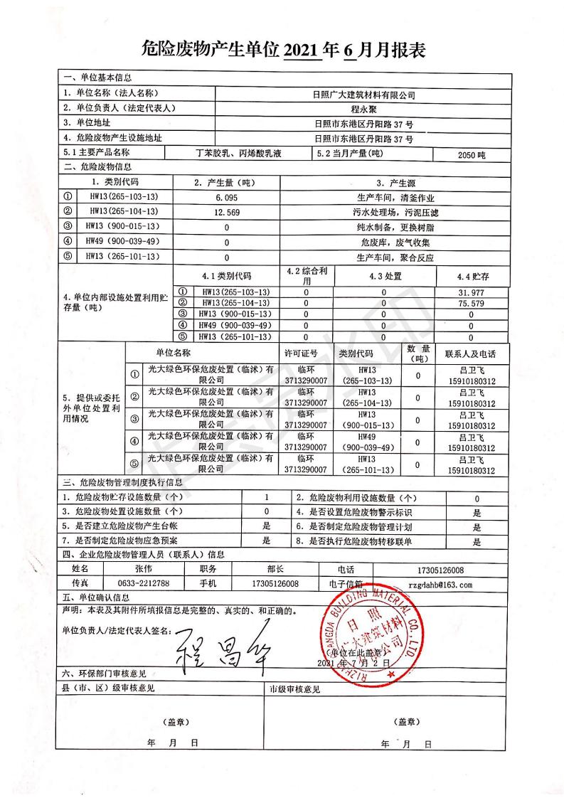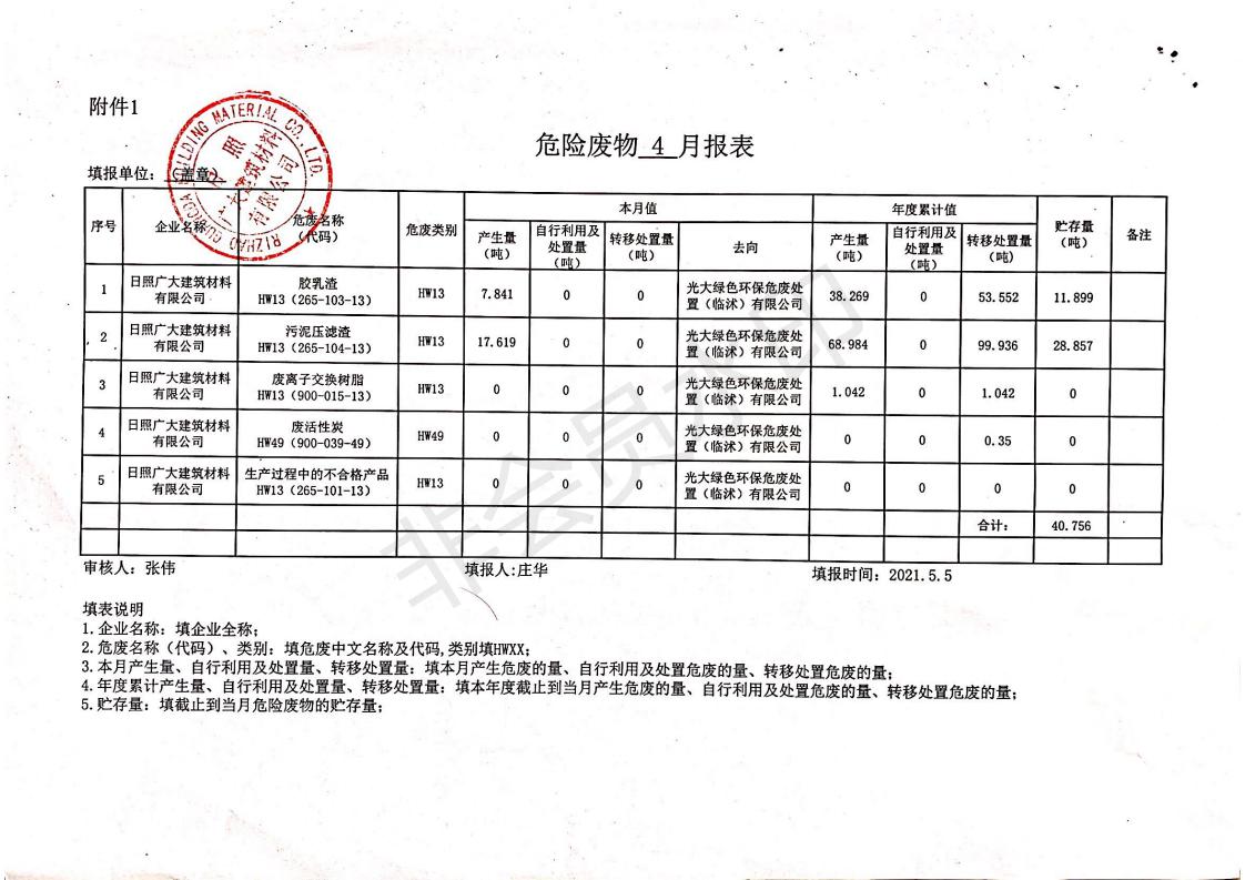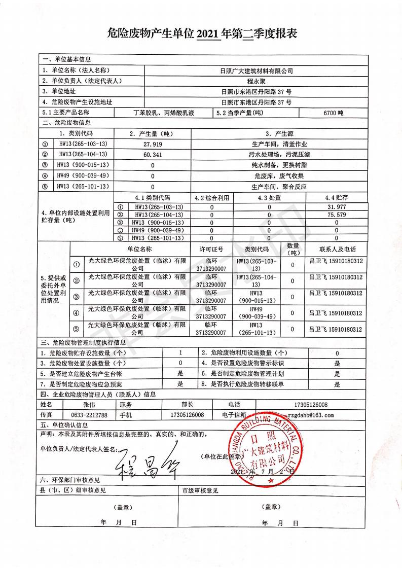 日照廣大建筑材料有限公司2021年04月~06月、第二季度產(chǎn)生報表