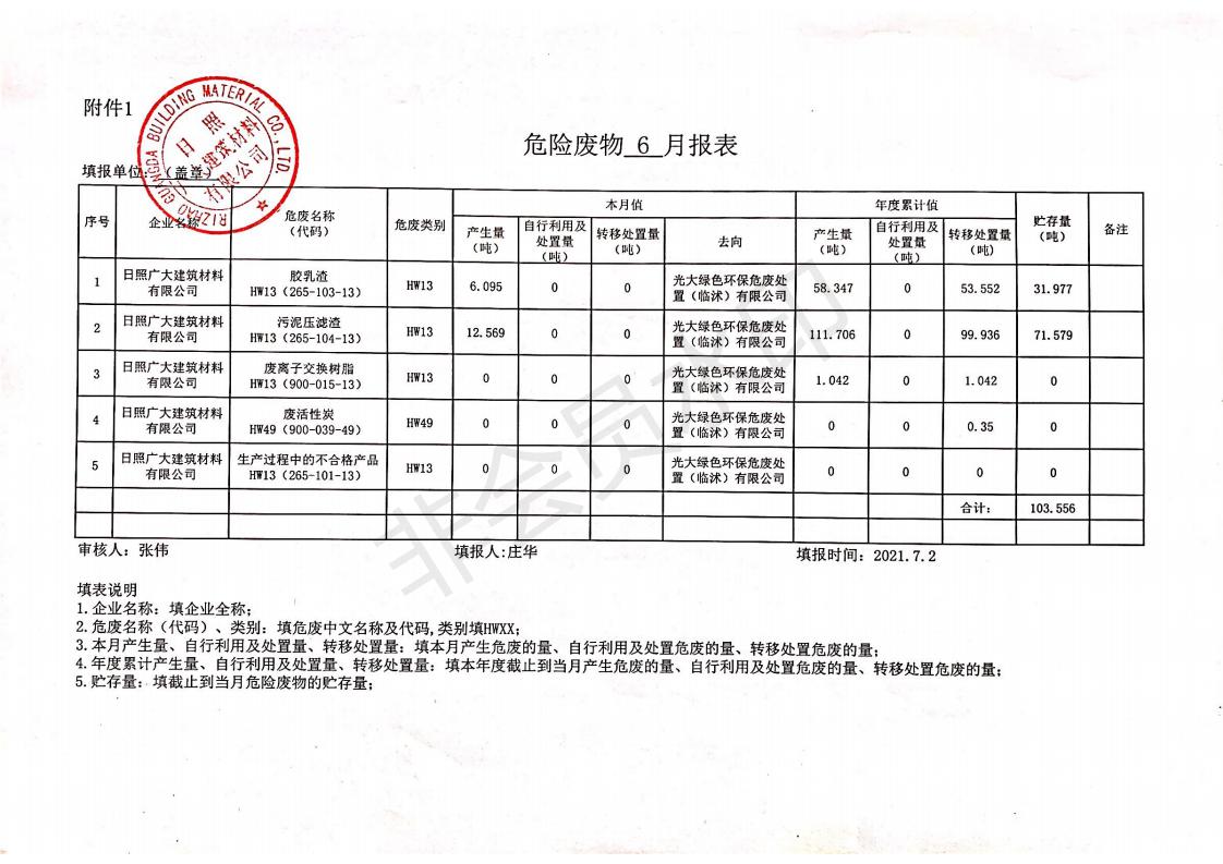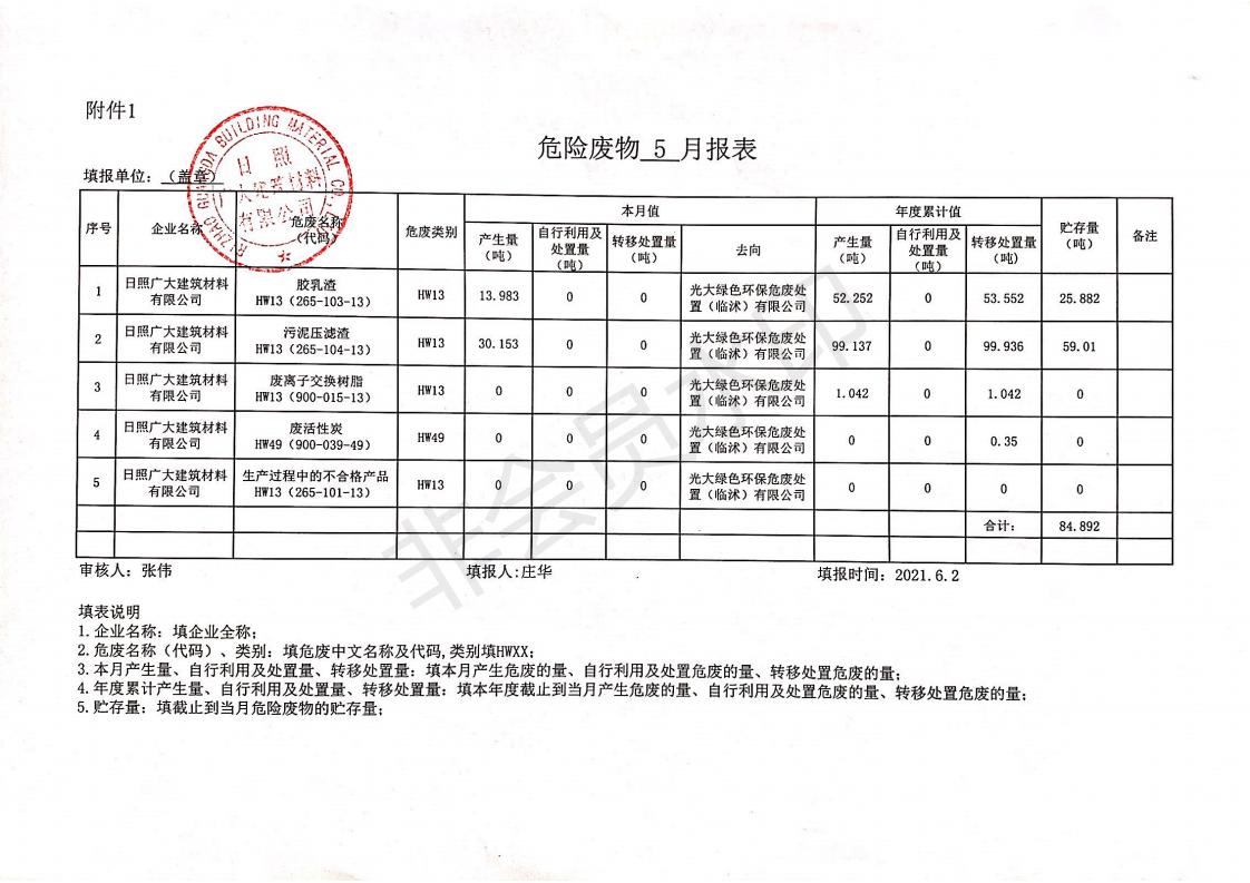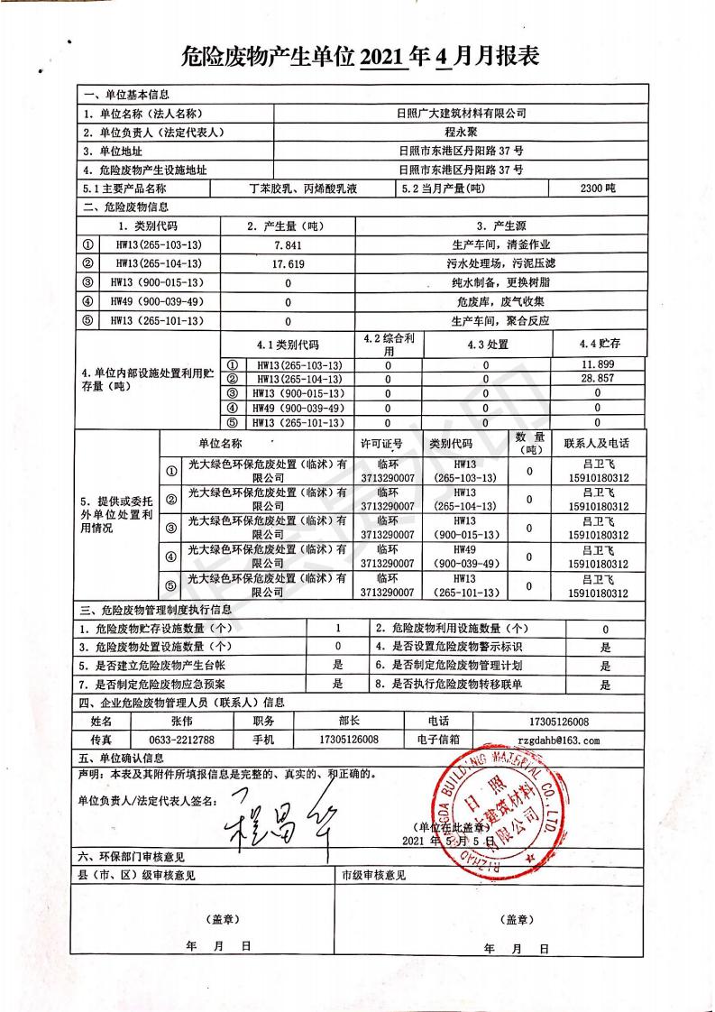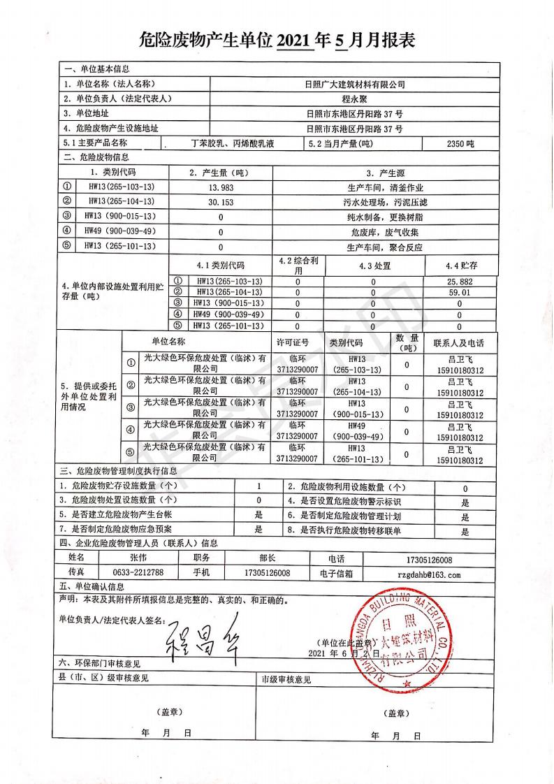 日照廣大建筑材料有限公司2021年04月~06月、第二季度產(chǎn)生報表